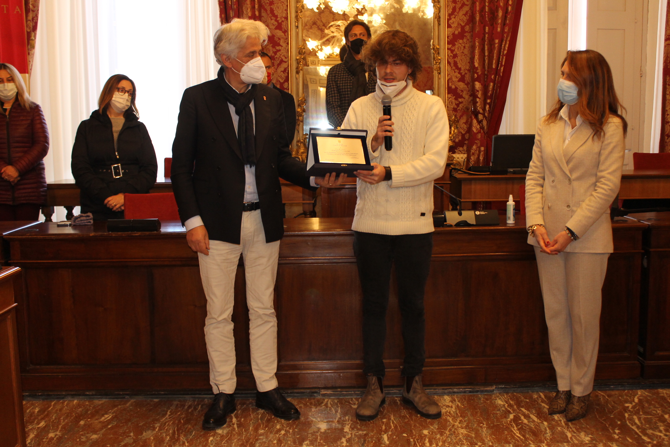 Ai protagonisti il sindaco Sandro Parcaroli, alla presenza di tutta la Giunta, ha consegnato una targa per simboleggiare il riconoscimento dell’Amministrazione e della città.