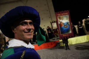 Il drappo 2021 è arrivato ieri sera a Porta Santa Caterina accolto da una buona cornice di pubblico nello scenario allestito su via Brunforte dalle contrade ospitanti Pila e Torre di Palme.
